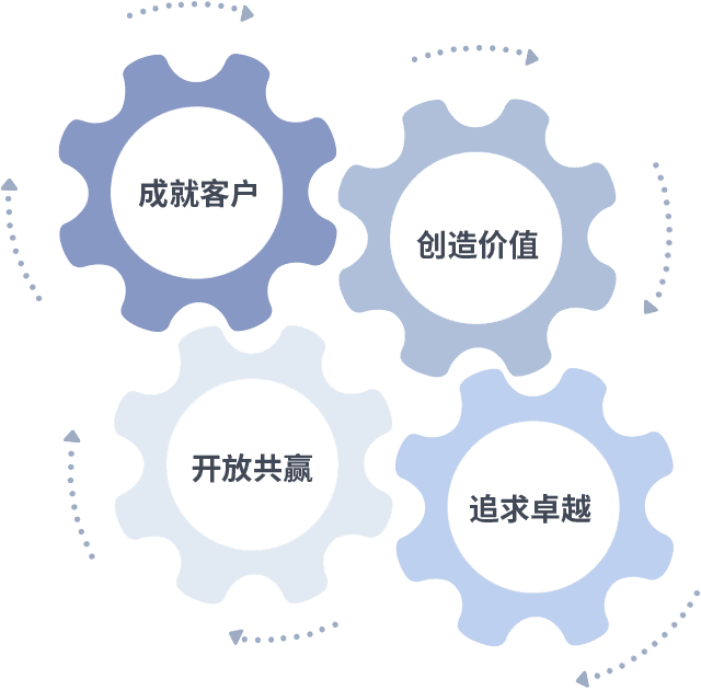 成就客户是一切决策的出发点,,,,创造价值是衡量所有工作的标准,,追求卓越是我们做事做人的态度,,开放共赢是我们的格局也是最终的结果。。。价值观的齿轮环环相扣,,推动着组织里的每个人不断向前。。。